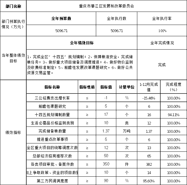 1.部門整體支出績效:根據年初設定的績效目標,工作總體完成情況很好。全年預算數為5096.71萬元,執行數為5096.71萬元,完成預算的100%。主要產出和效果:一是各項工作有序開展,經濟社會發展規劃的編制落實、投資管理、重大項目推進、物價管理、營商環境優化、糧食安全管理等各項工作均得到上級部門充分肯定。二是年初預算資金按工作進度100%支付,有效保障了各項工作的正常開展和運轉。