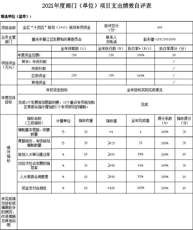 2.全區“十四五”規劃專項資金項目:根據年初設定的績效目標,項目總體完成情況很好。項目全年預算數為200萬元,執行數為200萬元,完成預算的100%。主要產出和效果:一是編制完成了一個發展規劃綱要和15個重點專項規劃。二是年初預算資金按工作進度100%支付。三是規劃的編制有效指導““十四五””期間我區經濟社會發展方向。