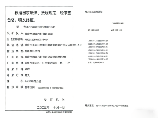 你司申請(qǐng)辦理重慶市鵬瑞石材有限公司建筑用砂巖礦采礦權(quán)續(xù)期登記、延續(xù)許可,已經(jīng)審查批準(zhǔn),現(xiàn)頒發(fā)不動(dòng)產(chǎn)權(quán)證書(shū)(采礦權(quán))、采礦許可證。
