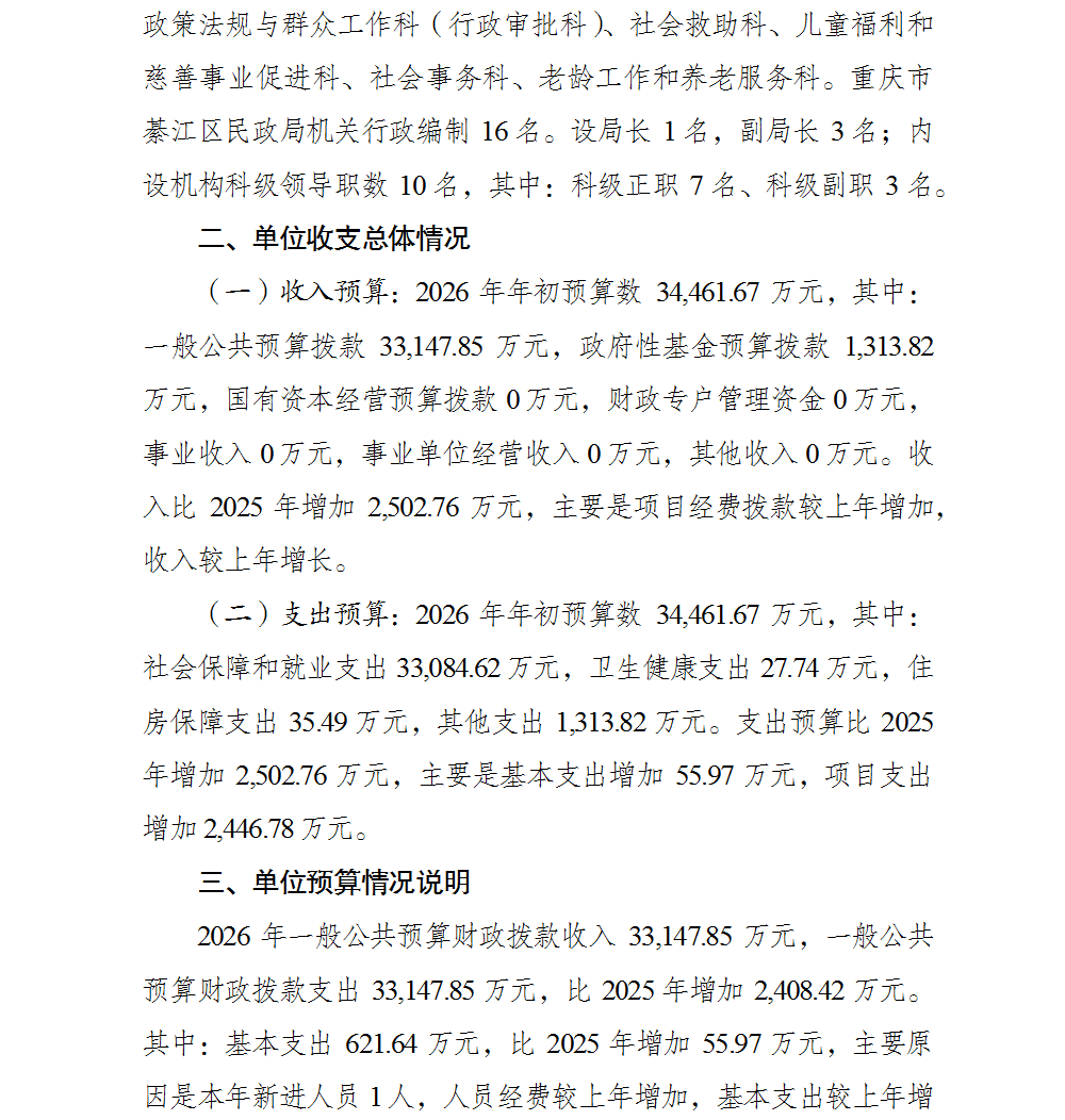 重慶市綦江區民政局(本級)2026年單位預算情況說明