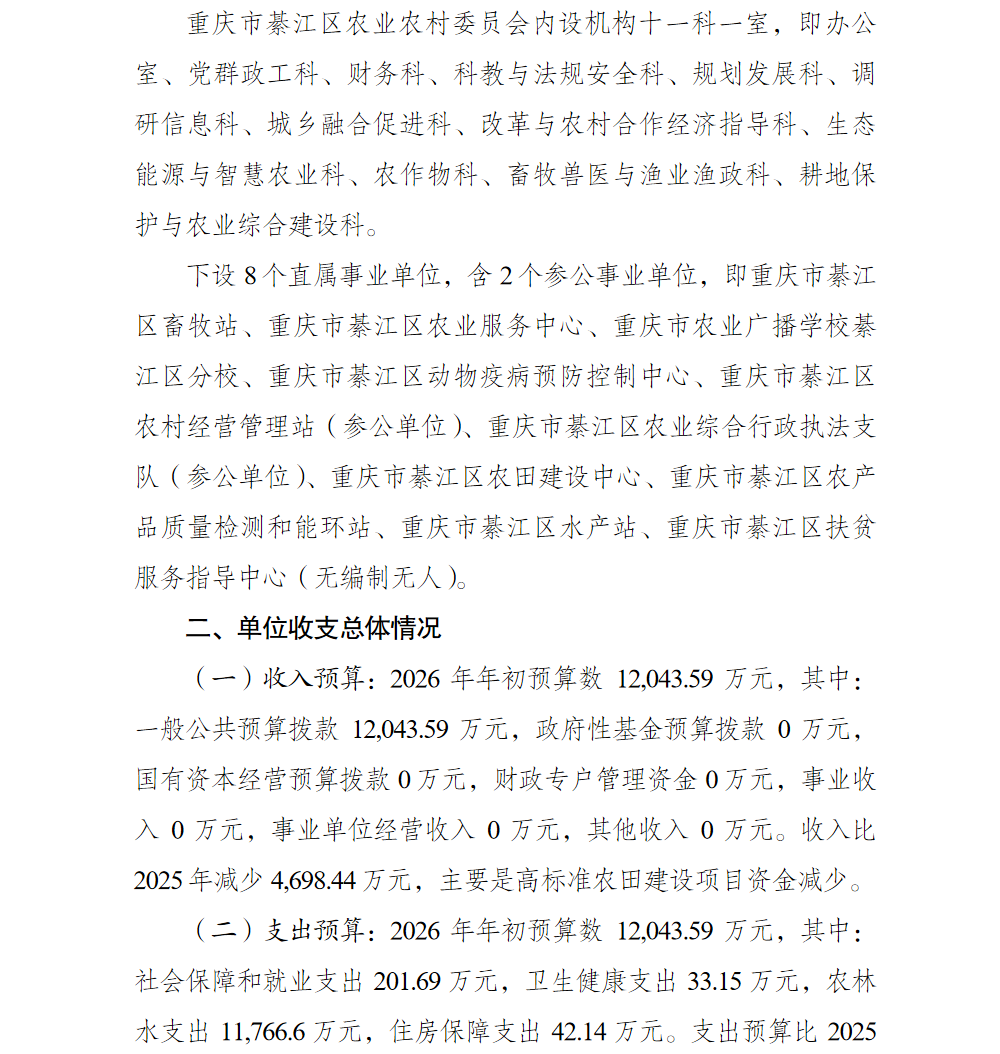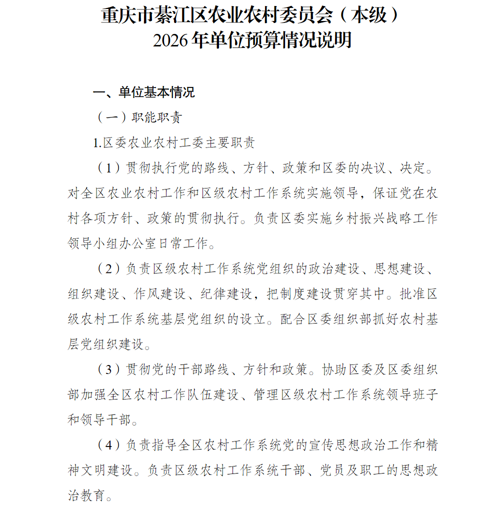 重慶市綦江區農業農村委員會(本級)2026年單位預算情況說明
