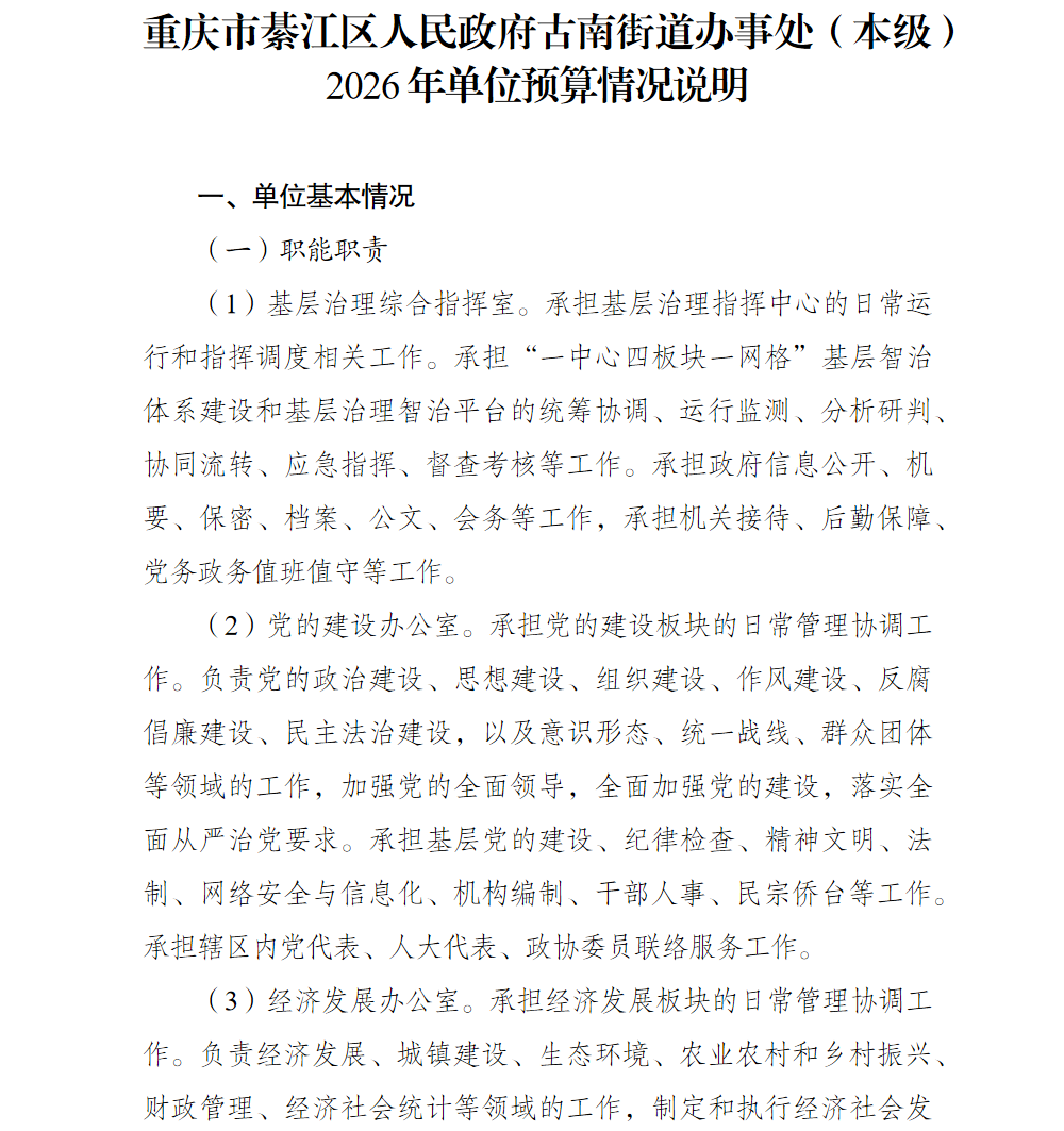 重慶市綦江區人民政府古南街道辦事處(本級)2026年單位預算情況說明