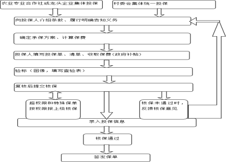 (五)承保機構收到投保單、匯總表、分戶清單和農戶保費后,進入業務系統錄入保單各項信息,并提交核保,核保通過后,打印保單和保險憑證;