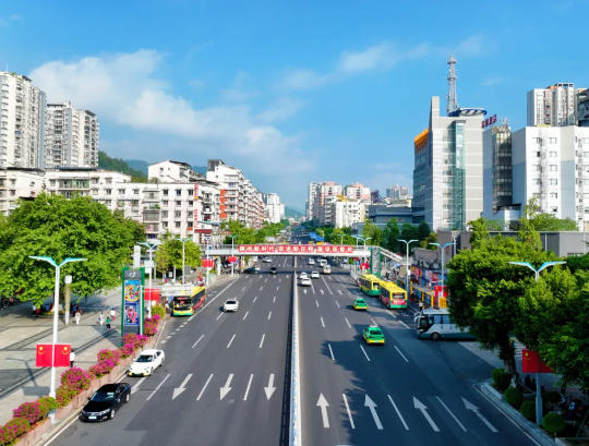 ▲綦城九龍大道兩側綠植郁郁蔥蔥、生機盎然,與川流不息的車輛共同勾勒出活力畫卷。通訊員 蘇渝 攝